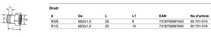 Raccord droit M22x1,5 par 1/2" pour TA RADIETT Réf. 50-701-516